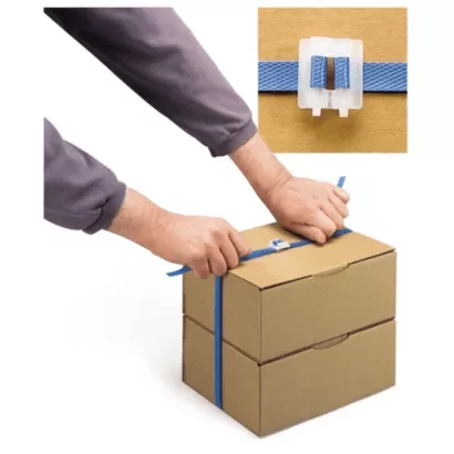 ![]() | Les boucles autobloquantes, en acier ou en plastique, maintiennent le cerclage de votre caisse sur le colis de manière ferme. |