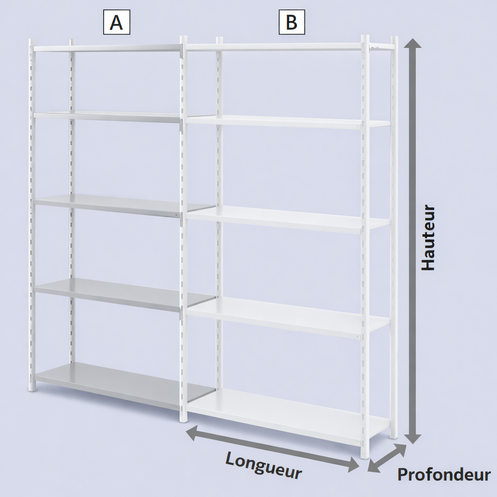 L’élément départ constitue la base du rayonnage. Il s’agit d’une structure complète composée de montants et de tablettes.