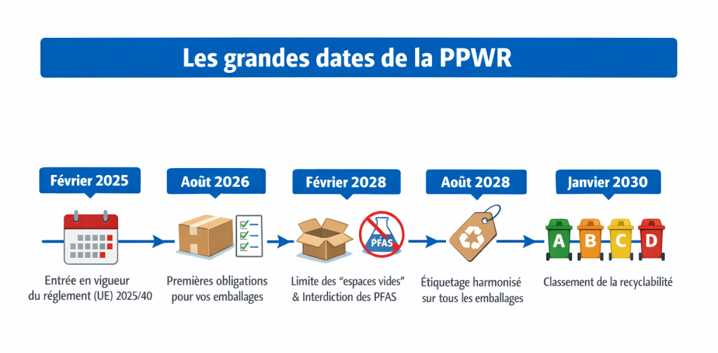 • Février 2028 : introduction de la limite sur les “espaces vides” dans les colis et interdiction des PFAS dans les emballages alimentaires.