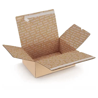 ![]() | La caisse carton brune à montage instantané et fermeture adhésive « aller-retour » est conçue pour pouvoir résister à deux expéditions : celle où vous envoyez vos produits, et celle où vos clients vous renvoient leur marchandise. |