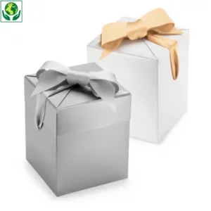 |  | La boîte cadeau avec ruban satin existe en gris et en blanc, et se monte instantanément par simple pression sur les côtés. Son ruban intégré la rend élégante, pour un effet cadeau immédiat. |